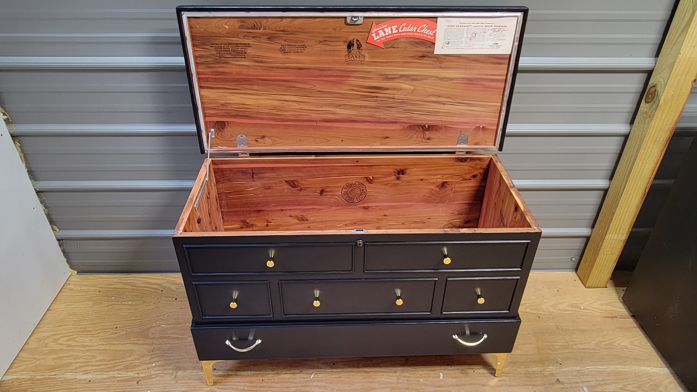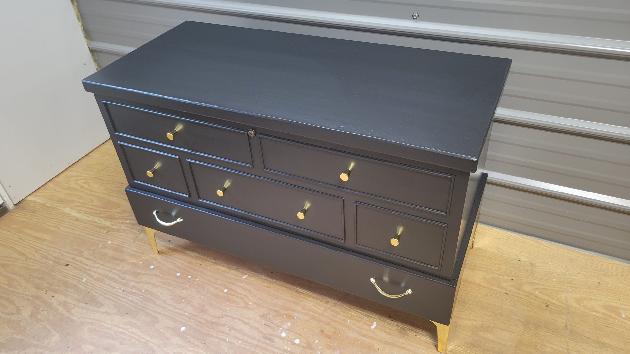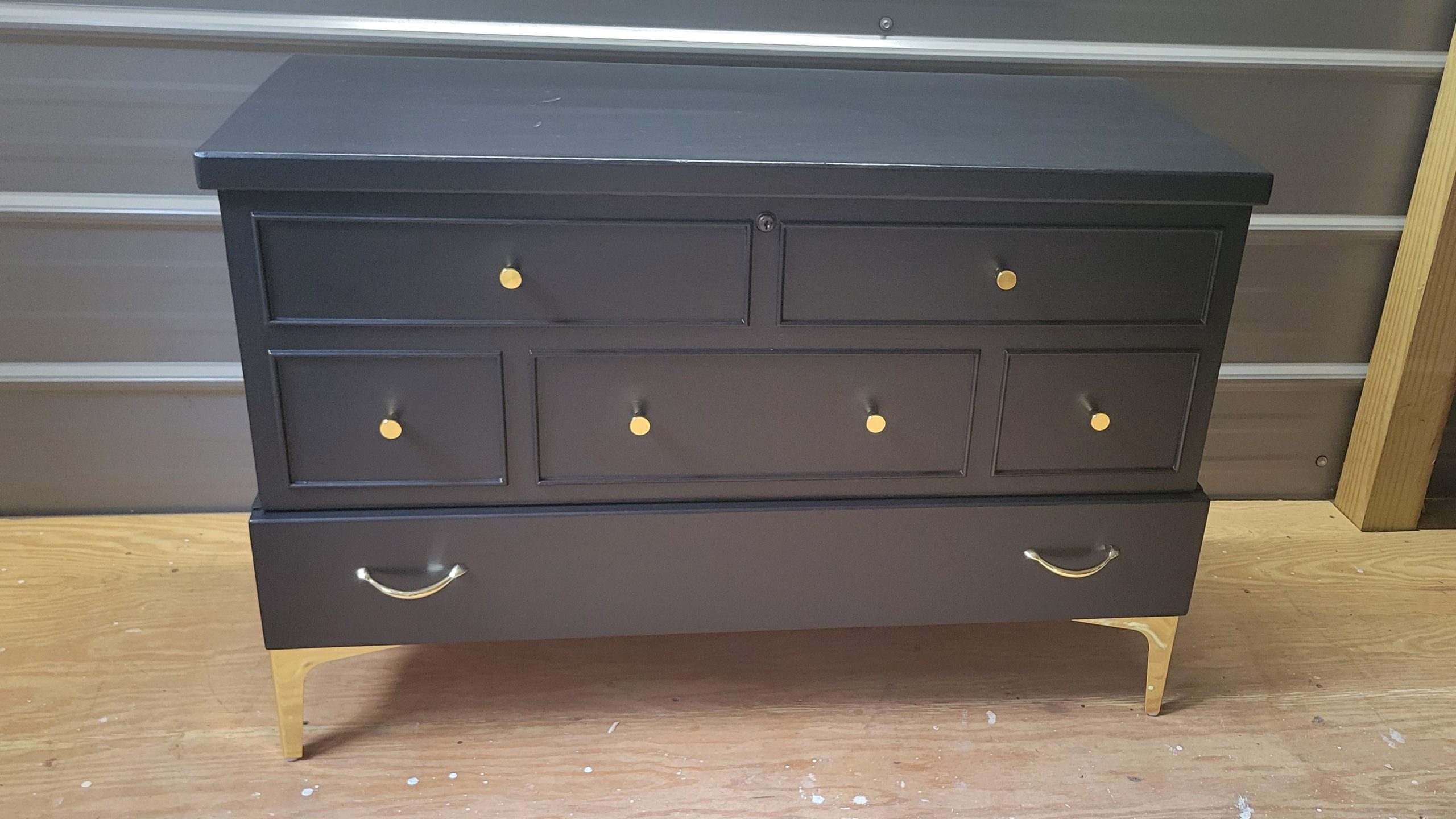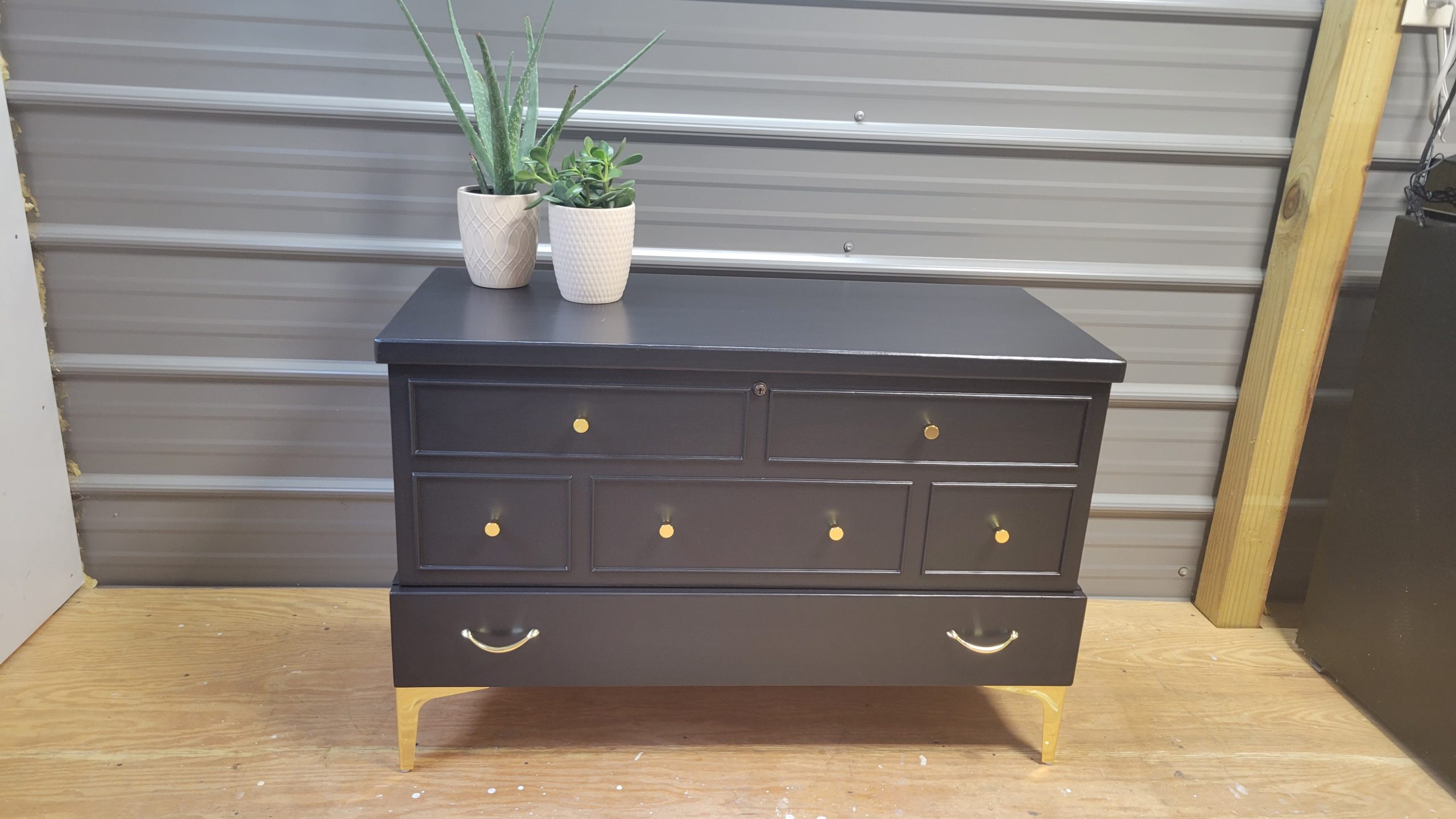 Lane Cedar ChestAmy Zielke-Huff2023-09-02T15:43:04+00:00 Lane Cedar Chest$25000DescriptionDimensionsDescription Beautiful refinished vintage 1956 Lane cedar chest. Large upper storage area with a drawer beneath the storage area. Painted Midnight Black with new hardware. Dimensions Cedar chest is 39″ wide 26″ tall 17 1/2″ deep Contact Us to See or Purchase This PieceReturn to Furniture Listings Related Projects Solid Oak Display Cabinet Classic Bedroom Set Rustic Whitewashed Pine Cabinet Rustic Farmhouse Coffee Table & Matching End Tables – Set of 3 Classic Traditional Cherry Highboy Dresser with Brass Hardware Ethan Allen Traditional Cherry China Cabinet Refinished French Country Sideboard / Cabinet – Distressed Ivory & Weathered Wood Top Refinished Klein Bros. Cedar Chest – Vintage Storage with Modern Elegance Pair of Crystal Table Lamps